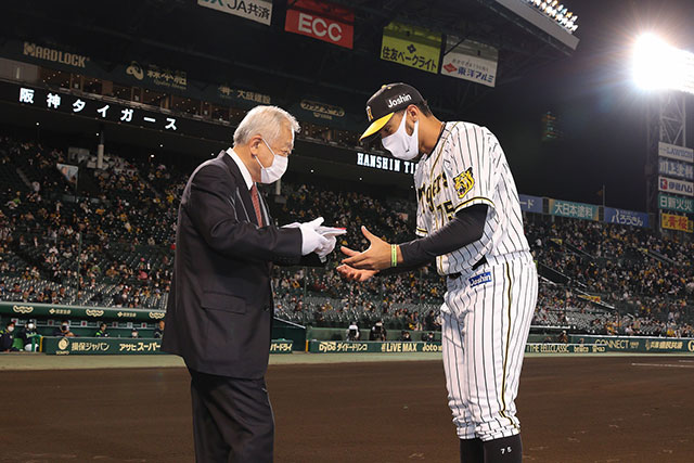 球団選定9月度月間最優秀選手にロベルト・スアレス選手が選ばれ、19日(火)、阪神甲子園球場での対東京ヤクルトスワローズ戦の試合前に表彰式を行いました。