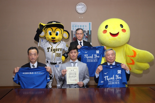 阪神タイガース選手会を代表して贈呈式に参加した坂本誠志郎選手へは、荒木一聡兵庫県副知事より感謝状が授与されました。