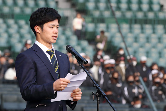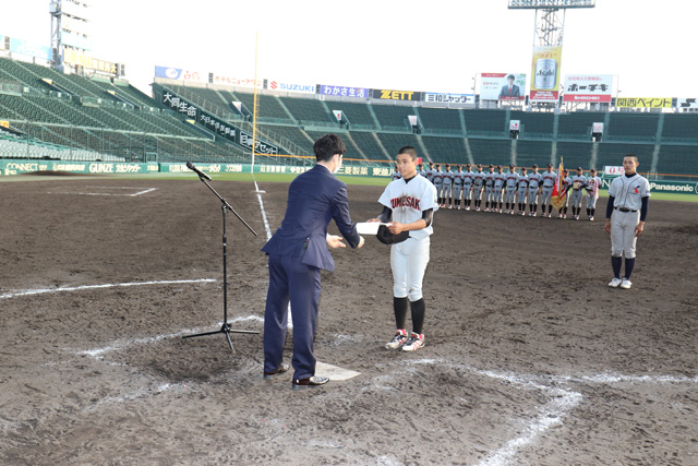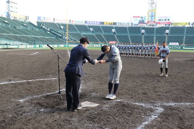 17回目を迎えた今年は、昨年に続き「兵庫夢前ヤング」が見事優勝を果たし、決勝戦終了後に行われた表彰式には、プレゼンターとして中野拓夢選手が登場しました。優勝した兵庫夢前ヤングには優勝旗とタイガースカップが、準優勝の関メディベースボール学院ヤングには準優勝盾が贈られました。