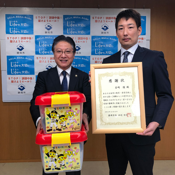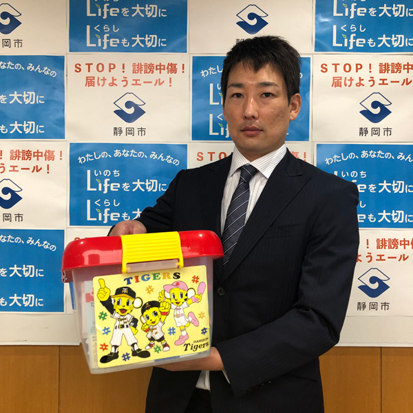 16日(木)、岩崎優選手が静岡市役所を訪問し、子どもたちへ玩具の寄贈式を行いました。