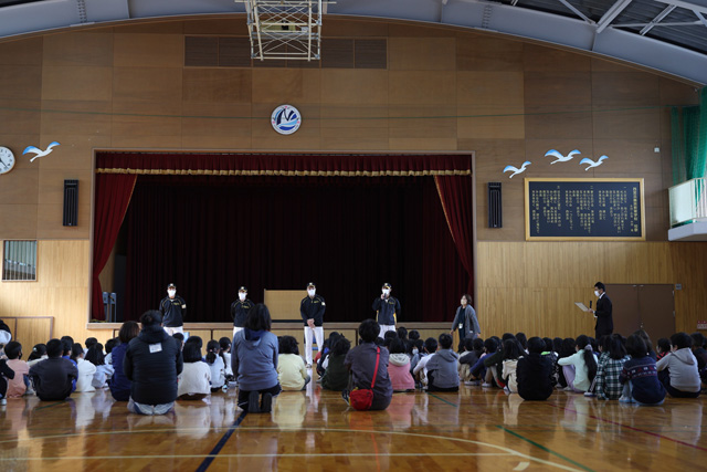 体育の授業の後、体育館にて1~4年生の児童の皆さんから温かい歓迎を受けた選手たちは、児童の皆さんからの質問に答え、束の間の交流を楽しみました。