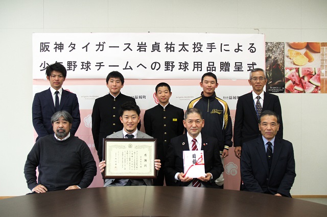 27日(月)、岩貞祐太選手が熊本県益城町役場を訪問し、益城町の少年野球チーム・小学校・中学校等に対して、今季のホールド数に応じた金額60万円(12ホールド×5万円)相当の野球用品の寄贈を行いましたのでお知らせいたします。