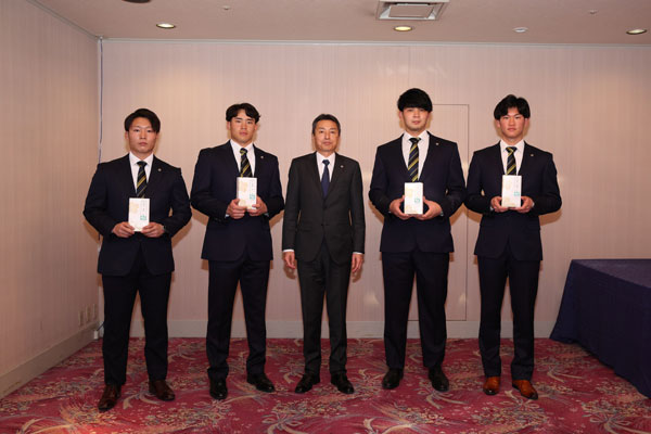 21日(金)、今年成人式を迎えた井上広大選手、及川雅貴選手、遠藤成選手、藤田健斗選手へ百北幸司代表取締役社長より記念品が贈呈されました。