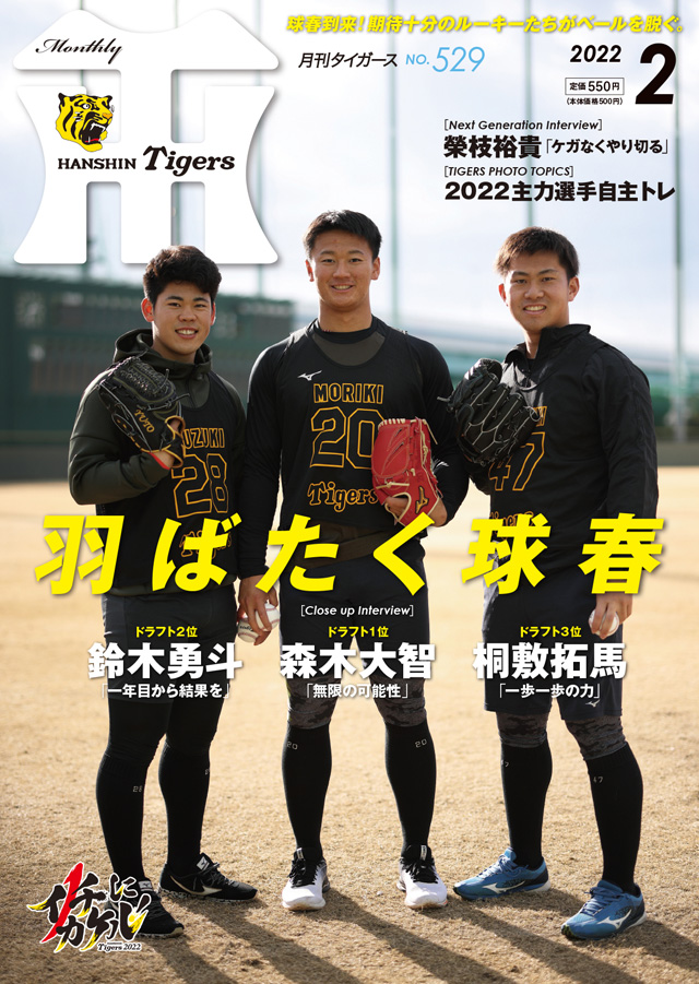 いよいよキャンプイン!月刊タイガース2022年2月号の表紙&巻頭インタビューには、期待のルーキー3投手、森木大智投手、鈴木勇斗投手、桐敷拓馬投手が登場。春季キャンプを前にして、プロの入り口に立った若トラが、それぞれの決意と抱負を語ります。また、正捕手争いに名乗りを上げる2年目、榮枝裕貴捕手のインタビューの他、グラビアページでは年明けから各地で始動した選手たちの自主トレの模様をたっぷりと紹介しています。
