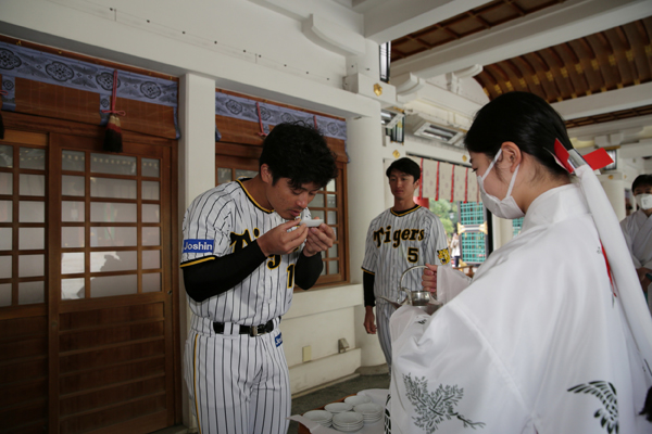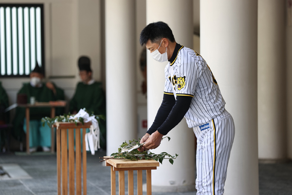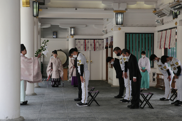 2日(水)、百北幸司代表取締役社長・谷本修副社長・嶌村聡球団本部長・矢野燿大監督・井上一樹ヘッドコーチ・近本光司選手・坂本誠志郎選手が、西宮神社(兵庫県西宮市)を参拝し、今シーズンの必勝を祈念しました。