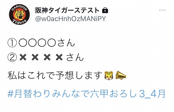 ご自身のTwitterアカウントにて「#月替わりみんなで六甲おろし3_4月」をつけて、予想される出演者名を投稿してください。