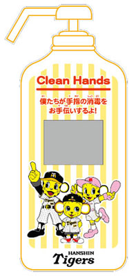 一見するとただのアルコールボトル型のオブジェ。でも手をかざすと手の上でマスコットたちが手をブラッシングしてくれる映像が映し出されます!甲子園球場1塁側タイガースショップ前に設置予定ですので、是非体験してください!