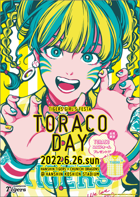 6月26日(日) 対中日ドラゴンズ戦(阪神甲子園球場開催) に開催される、女性ファン向けイベント「TORACO DAY」のメインビジュアルが決定いたしました!今年はビビッドな配色で人気のイラストレーターKaminさんがTORACOを描き下ろし、タイガースをおしゃれに可愛く応援します!