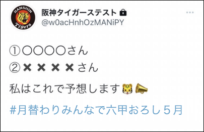 ご自身のTwitterに「#月替わりみんなで六甲おろし5月」をつけて、