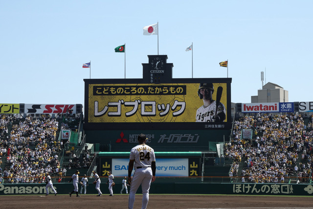 場内の大型ビジョンでは「こどもまつり」限定でスコアボードの選手名は「ひらがな」表記になっています。またタイガースの選手を身近に感じてもらうため、今年はタイガースの選手が登場する際に「こどものころのたからもの」をビジョンで紹介しています。