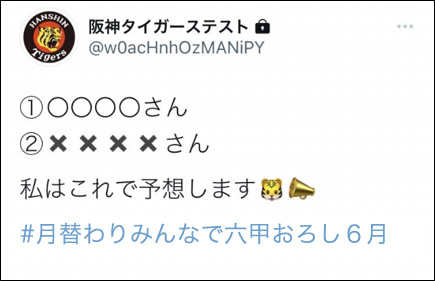 ご自身のTwitterに「#月替わりみんなで六甲おろし6月」をつけて、