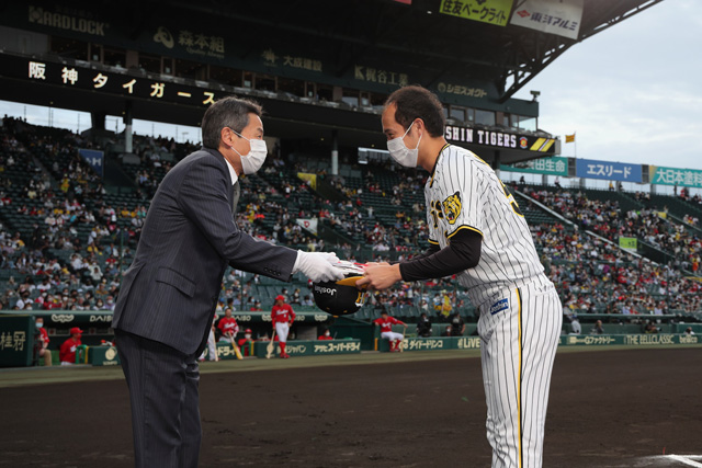 球団選定3・4月度月間最優秀選手に青柳晃洋選手が選ばれ、11日(水)、阪神甲子園球場での対広島東洋カープ戦の試合前に表彰式を行いました。