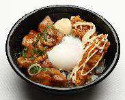 | 近本のさっぱり牛カルビ丼 ~淡路島産たまねぎ盛り~ | サトテルのWチキン輝(テリ)ヤキ丼 | 秋山の旨辛唐揚げ丼~ヤンニョムチキン風~ |