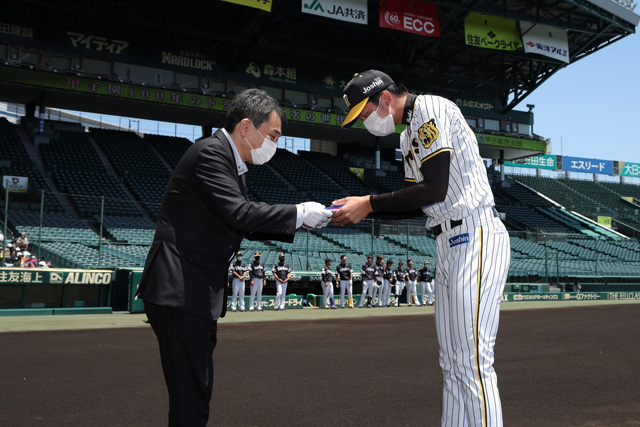 球団選定ファーム5月度月間最優秀選手に才木浩人選手が選ばれ、12日(日)、阪神甲子園球場で開催したウエスタン・リーグ対ソフトバンク戦の試合前に表彰式を行いました。