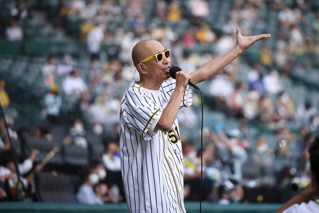 試合前のグラウンドで“サンプラザ中野くん”によるスペシャルLIVEを開催。1988年に爆発的ヒットした「Runner」を圧巻の歌唱力で披露いただきました。また試合直前には、この日のスターティングメンバーを紹介していただきました。