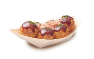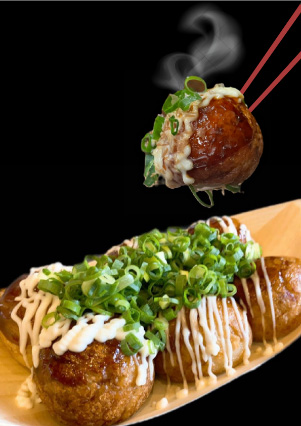 独自の製法から生まれる皮はパリッと、中はトロッと、たこはプリッとした、たこ焼は海の香りが引き立つあおさの他、様々な魚介だしや素干しえびの粉、新鮮な卵などを加え、手間ひまをかけて仕込んでいます。鉄板に流し込みじっくりと熱を加えることで、それぞれ旨味や香りがにじみ出て、"トロッ"とした食感と共に凝縮された全ての旨味が多重奏のように広がります。