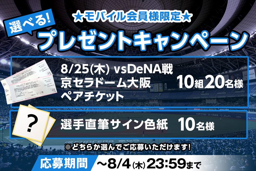 今回は、8月25日(木)に京セラドーム大阪で行われる対DeNA戦の上段内野指定席1塁側観戦チケットを、抽選でペア10組20名様にプレゼント!