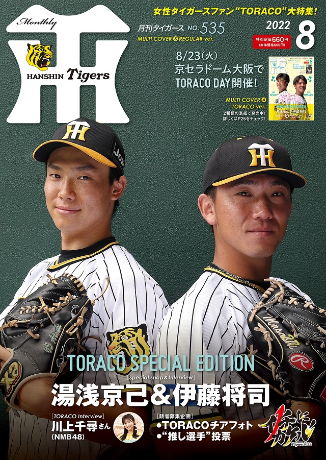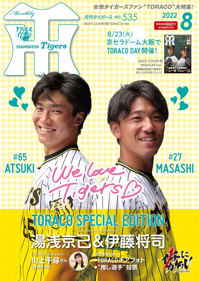 月刊タイガース8月号は、おしゃれに可愛くタイガースを応援する女性ファン「TORACO」を大特集!伊藤将司投手&湯浅京己投手が表紙を飾り、オフショット満載のグラビア、対談インタビューを掲載。またTORACO代表・NMB48川上千尋さんのインタビューや、TORACOの皆さんから募集した応援写真、“推し選手”投票など、TORACO情報満載の一冊です。