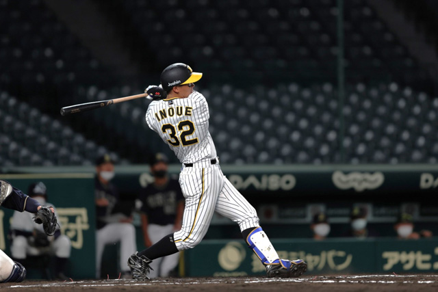 井上選手は7月全16試合に4番打者として先発出場し、安打、二塁打、塁打、打点でリーグトップの好成績を挙げ、チームの7月度月間勝率.800(12勝3敗1分)に大きく貢献しました。
