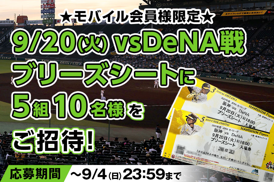 公式モバイルサイトでは、9月20日(火)に阪神甲子園球場で開催される対DeNA戦の観戦チケットを、抽選でペア5組10名様にプレゼントします。