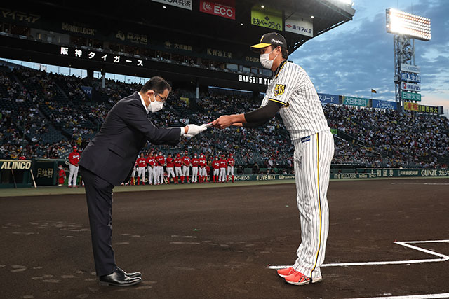 藤浪選手には、セントラル野球連盟、球団およびスポンサーより賞金と記念品が授与されました。