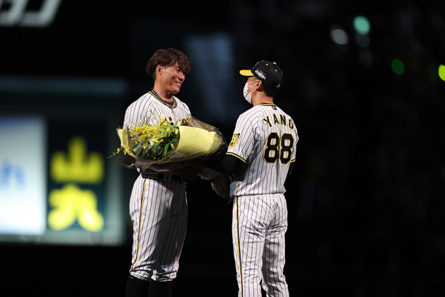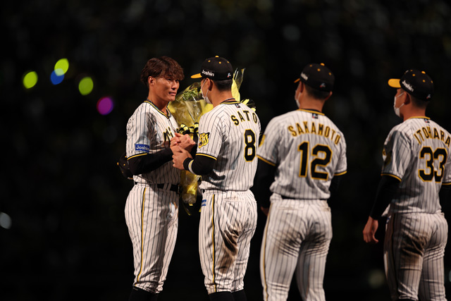 挨拶を終えた糸井選手には、矢野監督、坂本選手、糸原選手、佐藤輝選手から花束が手渡されました。