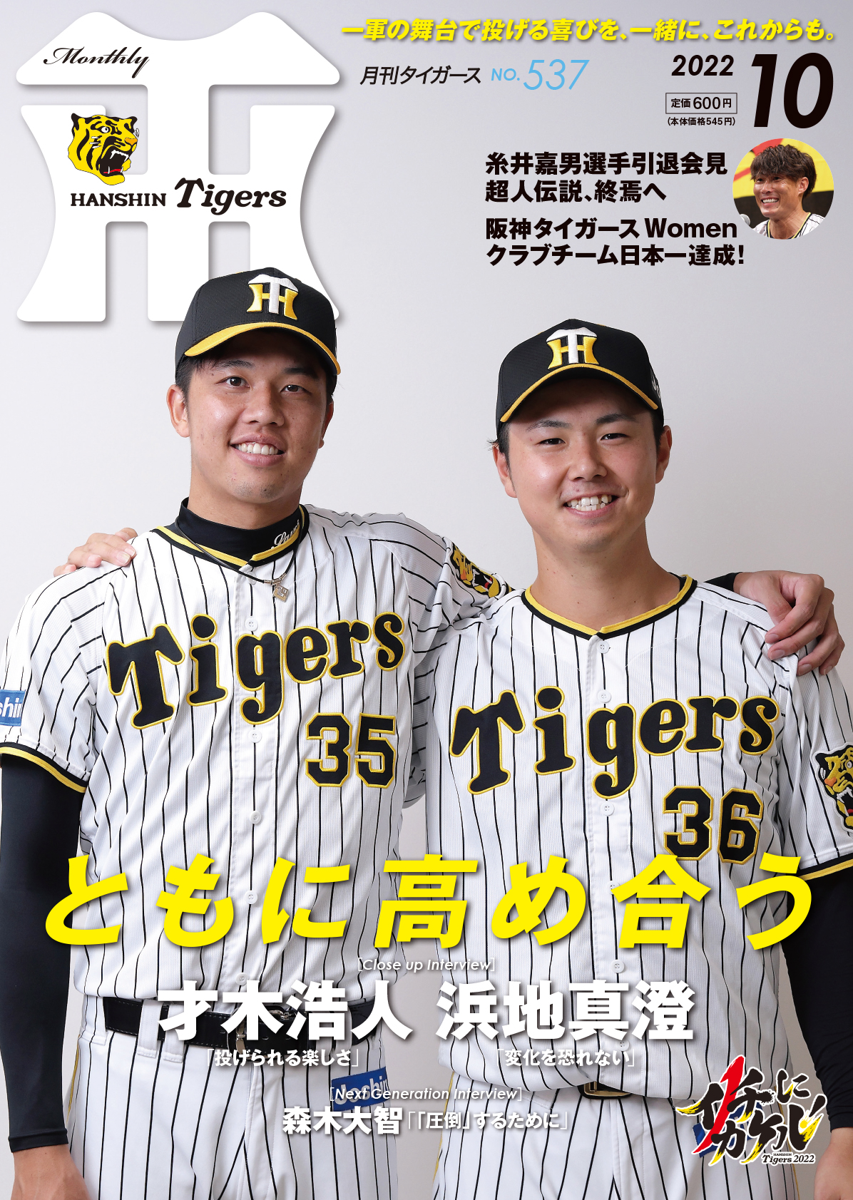 月刊タイガース10月号の表紙には、才木浩人投手と浜地真澄投手が初登場。同い年の2人が、一軍で活躍するようになった今シーズンまでの道のりをたっぷり語ってくれています。さらに糸井嘉男選手の引退会見の模様や、高卒ルーキー・森木大智投手のインタビューも掲載。その他、クラブチーム日本一を達成したタイガースWomenの戦いぶりなど、情報満載でお届けします。