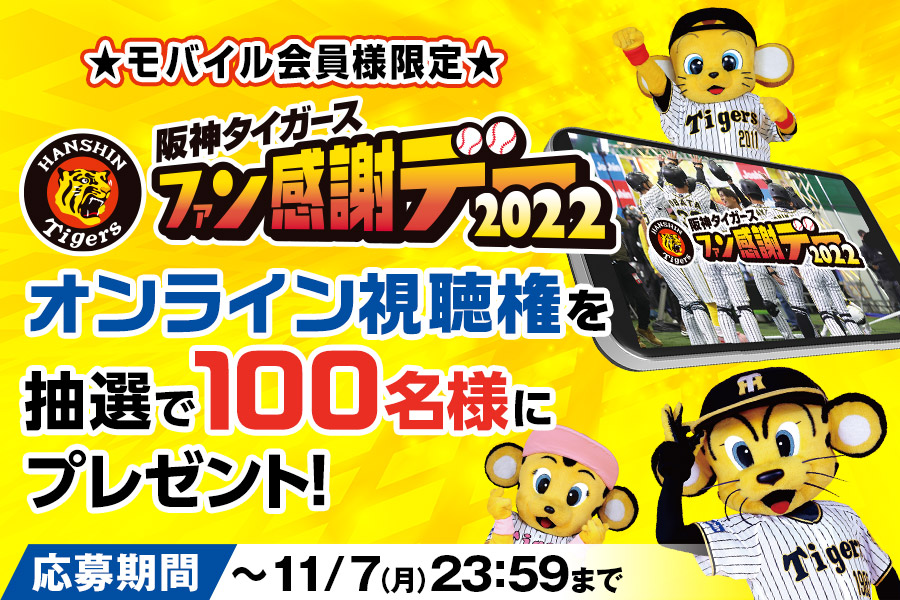 公式モバイルサイトでは会員様限定で、このファン感謝デーを「球団公式動画配信サービス 虎テレ」で視聴いただける権利を抽選で100名様にプレゼントいたします。球場までお越しいただけない方は、是非オンライン視聴でご参加ください!