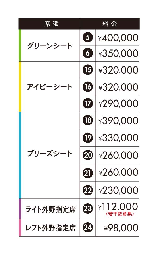 - ※2023年度新規募集席のうち、グリーンシート57万円エリア、SMBCシート(1塁)41万円エリア、SMBCシート(3塁)48万円エリア、SMBCシート(3塁)41万円エリア、SMBCシート(3塁)36万円エリア、アイビーシート44万円エリア、アイビーシート37万円エリアは申込多数のため、OPEN KOSHIENでの販売はございません。
