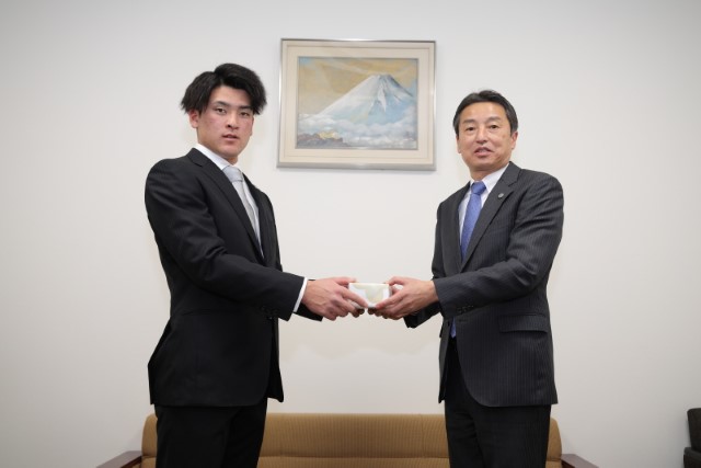 18日(水)、20歳を迎えた髙寺望夢選手へ百北幸司代表取締役社長より記念品が贈呈されました。