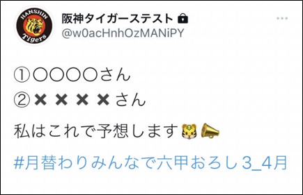 ご自身のTwitterに「#月替わりみんなで六甲おろし3_4月」をつけて、予想される出演者名を3月22日(水)までに投稿してください。