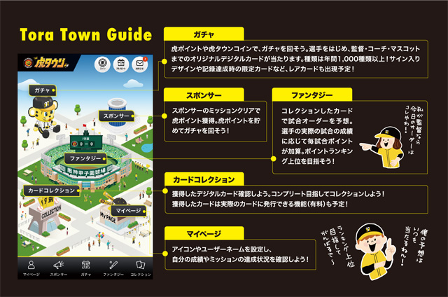 虎ポイントや有料コインを使って阪神タイガースの選手等の限定デジタルカードが獲得できるガチャや、集めたデジタルカードを使って実際の試合と連動したゲーム(ファンタジースポーツ)など、様々なコンテンツや豪華特典が盛り沢山!3月23日(木)~3月28日(火)の間、事前登録キャンペーンも実施中です。