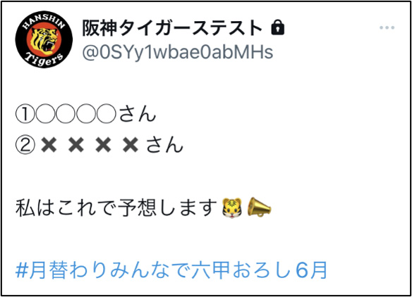 ご自身のTwitterに「#月替わりみんなで六甲おろし6月」をつけて、予想される出演者名を5月28日(日)までに投稿してください。