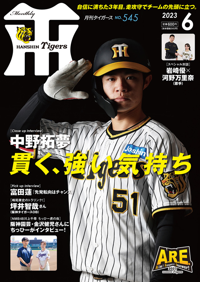 月刊タイガース6月号の表紙と巻頭インタビューには、プロ3年目を迎えた中野拓夢選手が登場。侍ジャパンの一員としてWBCで戦った経験や、今季からコンバートされたセカンドの守備、主力としてチームを引っ張る覚悟などを語ってくれています。その他、富田蓮投手のインタビュー、岩崎優投手と歌手・河野万里奈さんのスペシャル対談、NMB48・川上千尋さんが阪神園芸の神整備に迫る特別企画など、今月もタイガース情報満載でお届けします。