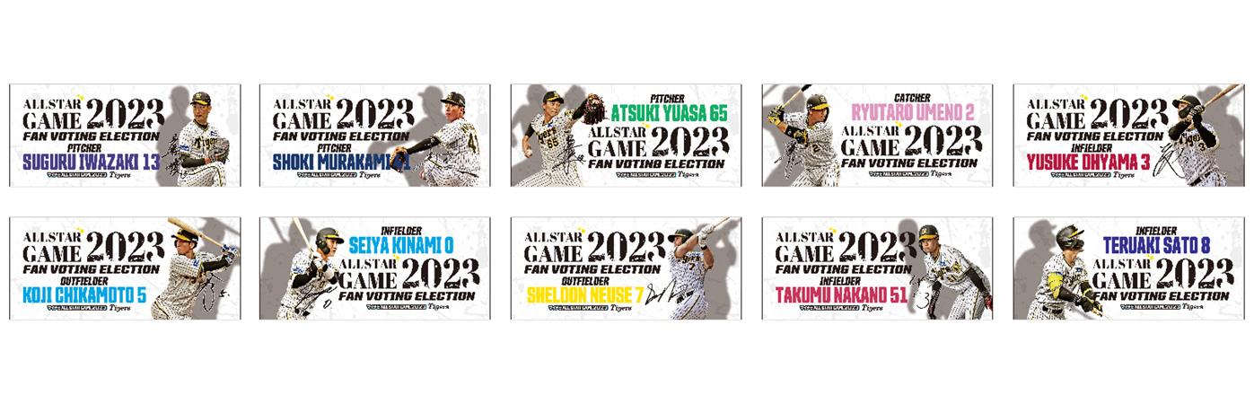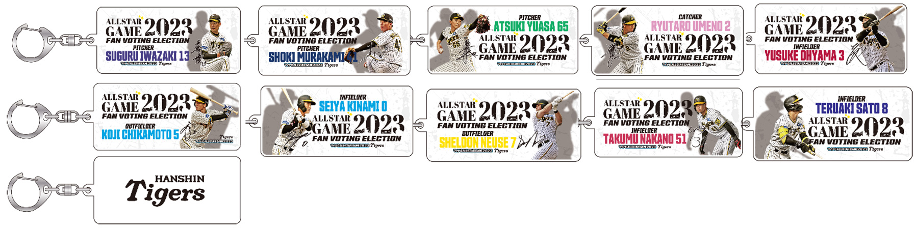 7月5日(木)より、「マイナビオールスターゲーム2023」にファン投票にて選出されました、岩崎優選手、村上頌樹選手、湯浅京己選手、梅野隆太郎選手、大山悠輔選手、 近本光司選手、木浪聖也選手、シェルドン・ノイジー選手、中野拓夢選手、佐藤輝明選手の記念グッズを下記のとおり発売いたします。