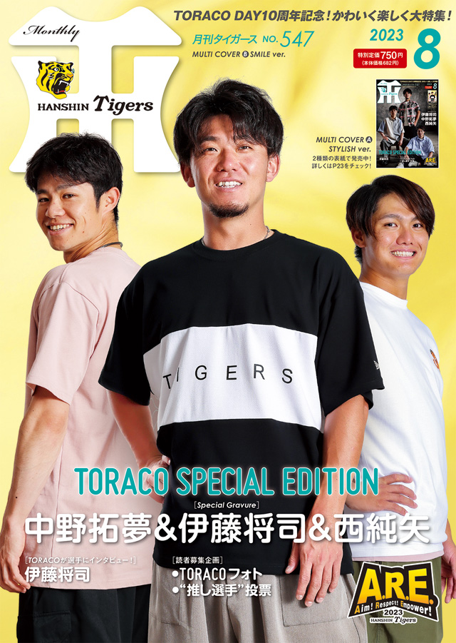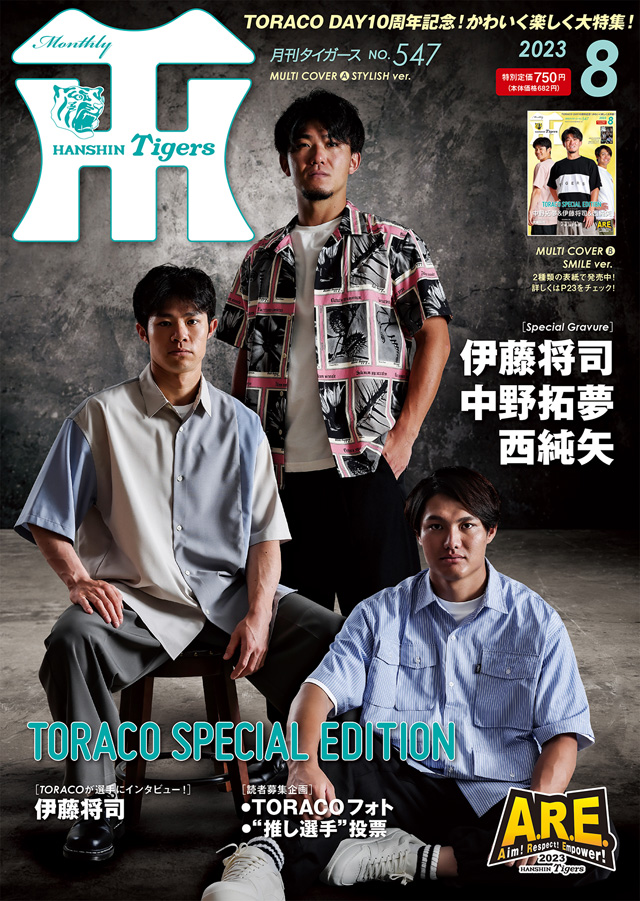 月刊タイガース8月号は、「TORACO」を大特集!伊藤将司投手&中野拓夢選手&西純矢投手がカジュアルコーデで表紙を飾り、スペシャルグラビアも掲載。10名のTORACOによる伊藤将司投手へのインタビューや、みなさんから募集したTORACOフォト、“推し選手”投票などの特別企画を実施しています。もちろん、前川右京選手のインタビューや充実の連載コーナーなど、タイガース情報も満載の一冊です。