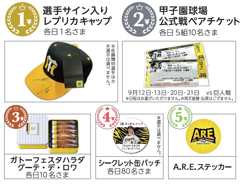 8月16日(水)から23日(水)までの期間限定で、阪神食品館(レストラン含む)で税込1,000円以上お買い上げのうえお買い上げレシートと、8階「阪神タイガースショップTEAM SHOP CLUBHOUSE」で税込3,000円以上お買い上げいただき、両方のレシートをご提示いただきますと抽選で下記の賞品をプレゼントします!