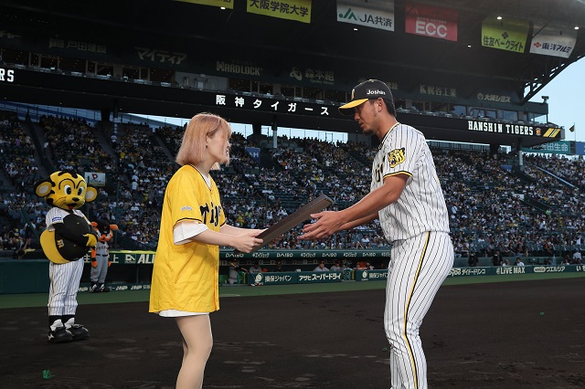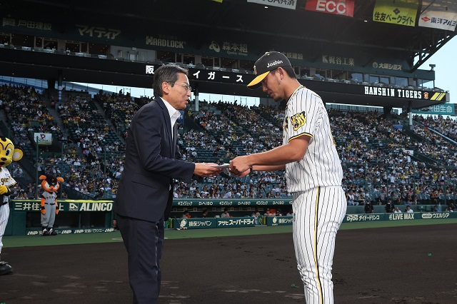 球団選定8月度月間最優秀選手に伊藤将司選手が選ばれ、13日(水)、阪神甲子園球場での対読売ジャイアンツ戦の試合前に表彰式を行いました。