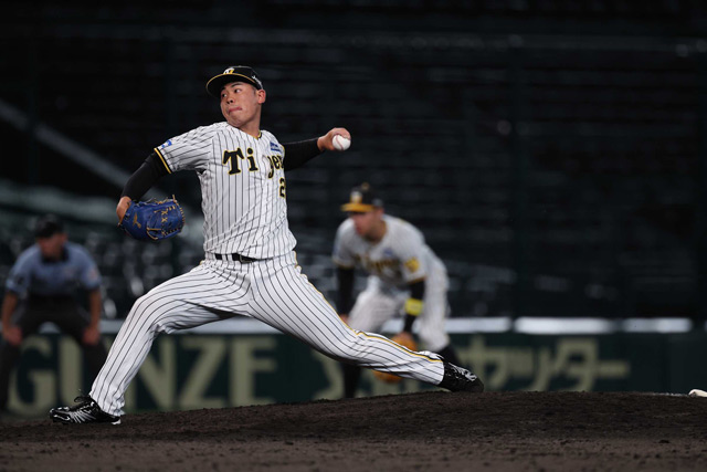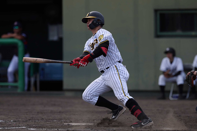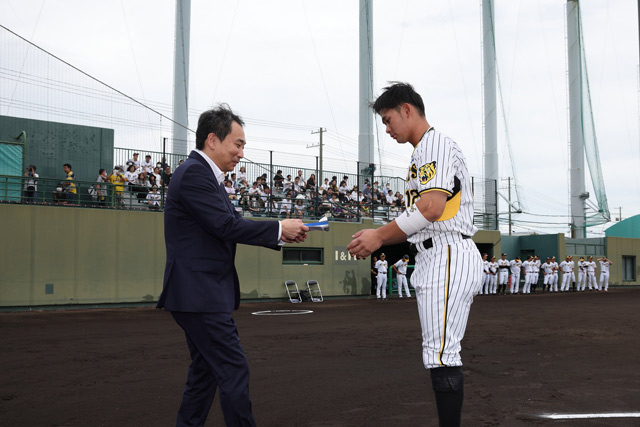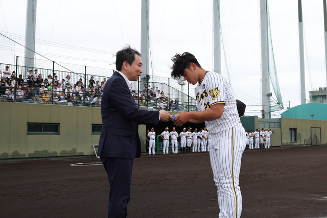 球団選定ファーム7月度月間最優秀選手に選ばれた鈴木勇斗選手、8月度月間最優秀選手に選ばれた野口恭佑選手の表彰式を21日(木)、阪神鳴尾浜球場で開催したウエスタン・リーグ対オリックス・バファローズ戦の試合前に行いました。