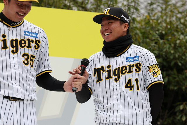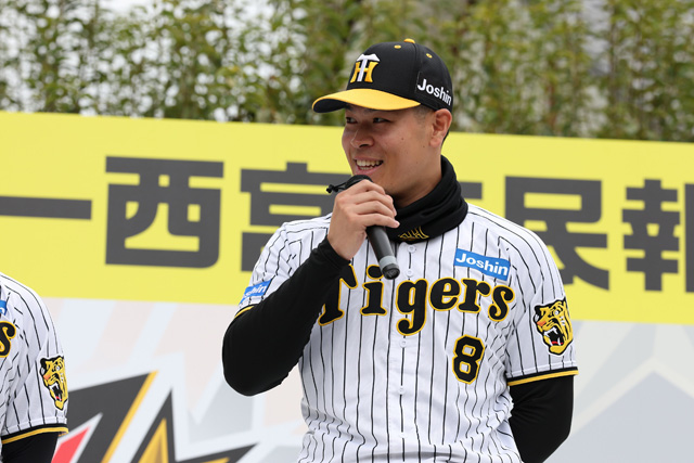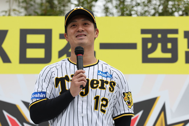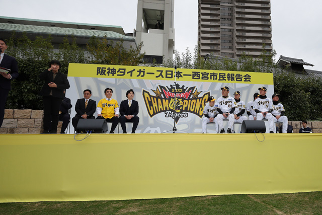 27日(月)、岡田彰布監督、近本光司選手、坂本誠志郎選手、佐藤輝明選手、才木浩人選手、村上頌樹選手が尼崎市に続き西宮市主催の「阪神タイガース日本一西宮市民報告会」に参加し、リーグ優勝と日本一を報告いたしました。