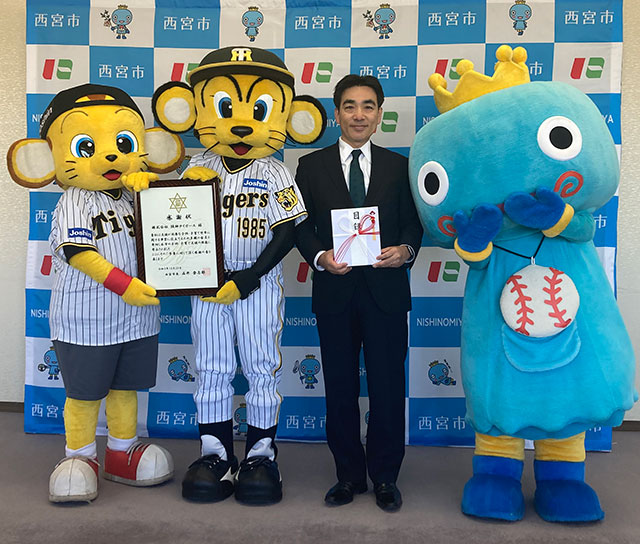 阪神タイガースを代表して贈呈式に参加したトラッキー・キー太へは、石井登志郎西宮市長より感謝状が授与されました。