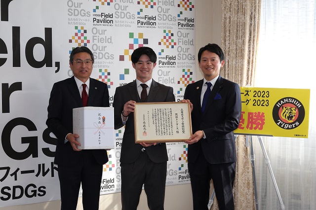 この度、阪神タイガースが兵庫県スポーツ賞特別賞を受賞し、25日(月)、兵庫県庁にて贈呈式が行われました。贈呈式には百北幸司社長と中野拓夢選手会長が出席し、齋藤元彦知事より表彰状と記念品が贈呈されました。