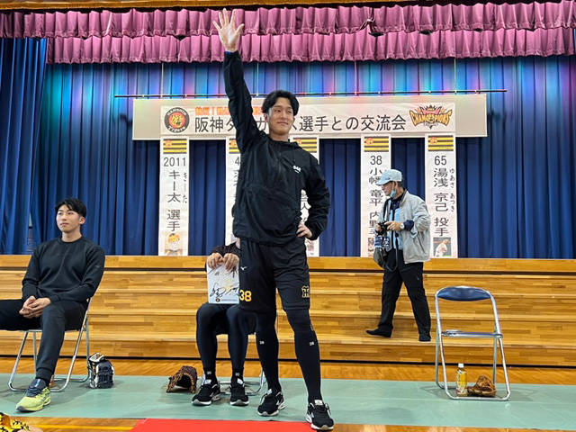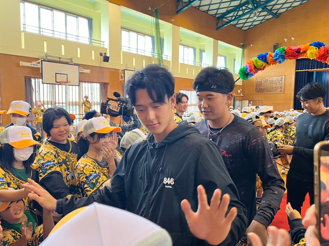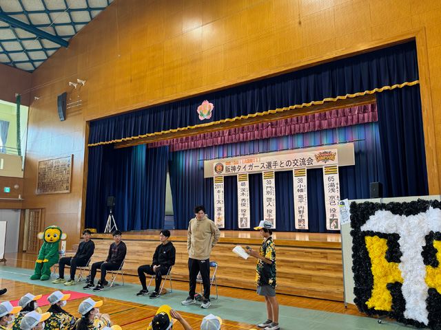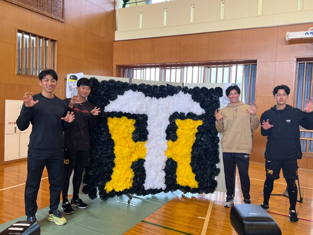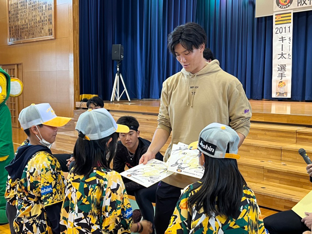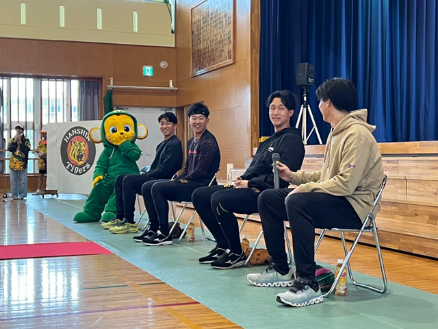 30日(火)、湯浅京己選手、小幡竜平選手、門別啓人選手、茨木秀俊選手が、ファームの春季キャンプ地である沖縄県うるま市のうるま市立川崎小学校を訪問しました。
