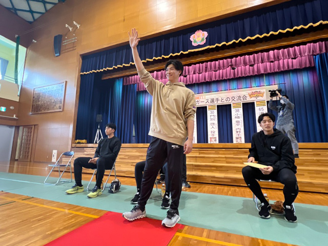 生徒の皆さんとの交流会では、選手らがキャッチボールやティーバッティングなどのパフォーマンスを披露したり、質問コーナーやゲーム会などで楽しい時間を過ごしました。