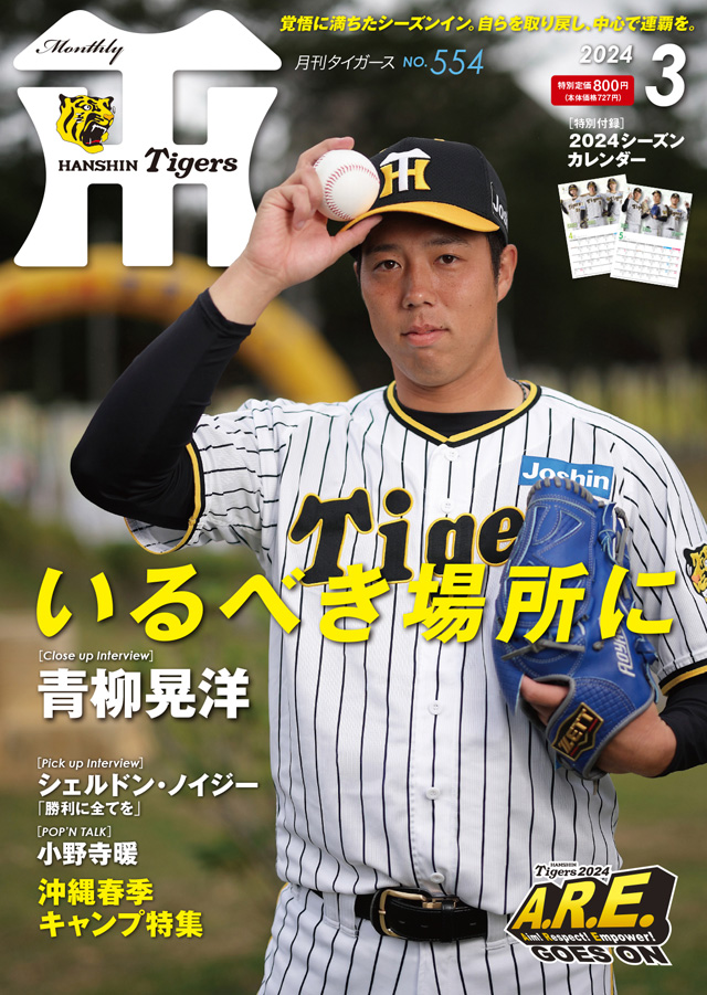 月刊タイガース3月号は春季キャンプ特集!表紙と巻頭インタビューには青柳晃洋投手が登場し、エース復活を目指す現在の心境を語ってくれています。また、シェルドン・ノイジー選手のインタビューや小野寺暖選手のプライベートトークに加え、春季キャンプの写真もたっぷり掲載。さらには特別付録として「2024シーズンカレンダー」もついており、3月29日の開幕が待ち遠しくなる一冊です。