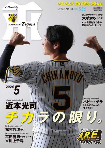 月刊タイガース5月号の表紙と巻頭インタビューには近本光司選手が登場。今回は近本選手が影響を受けているというサッカーコミック「アオアシ」とのコラボ企画として、作品の魅力についてたっぷり語ってくれたほか、作者・小林有吾先生からの似顔絵やメッセージも紹介しています。その他、ハビー・ゲラ投手、川原陸投手、タレント・松村邦洋さんのインタビュー、平田勝男ヘッドコーチとNMB48・川上千尋さんの対談も掲載。今月もタイガース情報満載でお届けします。