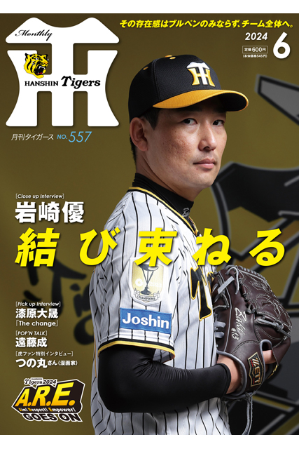 月刊タイガース6月号の表紙と巻頭インタビューには岩崎優投手が登場。リリーフ陣を支える大黒柱が、これまでの野球人生や後輩たちへの接し方などをたっぷりと語ってくれた他、自主トレをともにしている「TEAM ZAKI」のメンバー全員に岩崎投手への思いを取材しました。その他、漆原大晟投手、遠藤成選手、漫画家・つの丸さんのインタビューも掲載。今月もタイガース情報満載でお届けします。