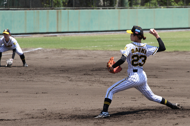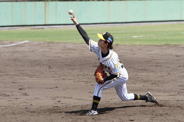 佐伯絵美選手(7回を投げ切り、見事な完封勝利)
