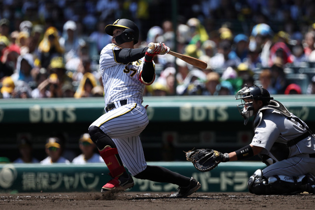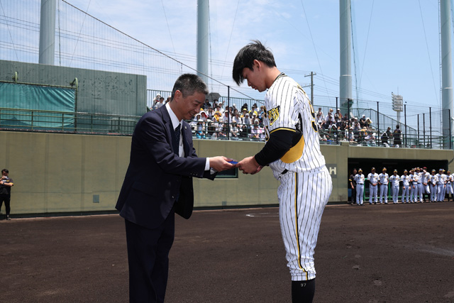 球団選定ファーム5月度月間最優秀選手に野口恭佑選手が選ばれ、12日(水)、阪神鳴尾浜球場で開催したウエスタン・リーグ対オリックス・バファローズ戦の試合前に表彰式を行いました。
