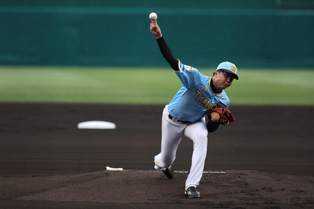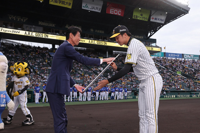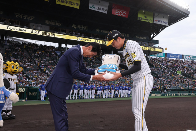 26日(水)、阪神甲子園球場での対中日ドラゴンズ戦の試合前に、日本生命セ・パ交流戦「日本生命 優秀選手賞」を受賞した才木浩人選手の表彰式が行われました。